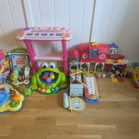Fisher-Price babyleker sett. Inneholder flere fargerike aktivitetsleker for små barn, blant annet leker med hjul, speil, knapper, rulle- og snurrefunksjoner. Lekene er laget i plast med ulike former og strukturer som kan stimulere barnets sanser og finmotorikk. Passer til tidlig lek på gulv eller i lekegrind.