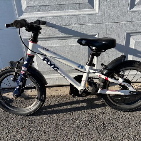 Frog 43 barnesykkel med 14" hjul. Sykkelen har oransje ramme og svarte detaljer som sete, styre og skjermer. Utstyrt med nye bremser klosser og vaier foran og bak, pedaler med refleks og grovmønstrede dekk som gir godt grep på asfalt og grus. Passer som første tråsykkel for barn som skal over fra balansesykkel til vanlig sykkel, avhengig av høyde og ferdighetsnivå.