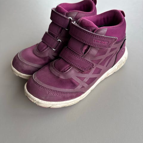 Viking joggesko til barn, størrelse 35 .Skoene er i lilla og lys lilla med detaljer i gult og mørkere lilla. Modellen har to borrelåsstropper over vristen for enkel av- og påtaking. Overdelen ser ut til å være i tekstil med syntetiske forsterkninger, og skoene har polstret kant rundt ankelen for bedre komfort. Yttersålen er i gummi med mønster for grep. Passer til jente til hverdagsbruk og lek ute og inne.
