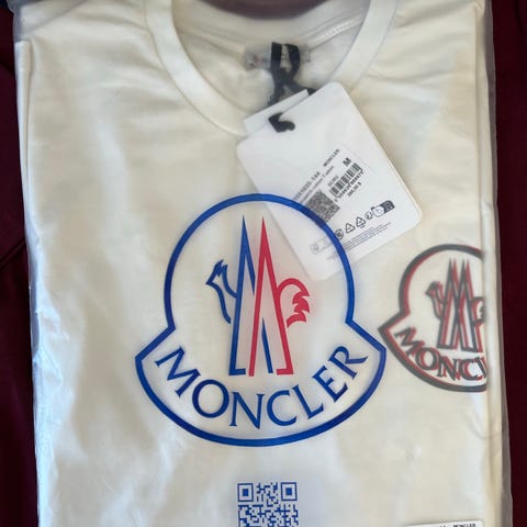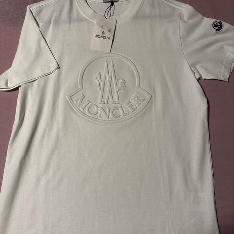 T-skjorte fra Moncler i hvit i størrelse medium. Moncler print med tennisball i logoen foran, med Moncler logo på den ene armen også. Svært lite og pent brukt. Nypris 2999.