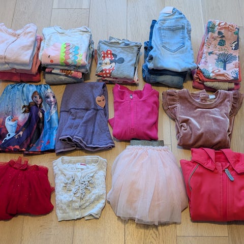 Stor klespakke 98/104, en genser i 92 er brukt helt frem til hun nå er fem år, så stor i str.
