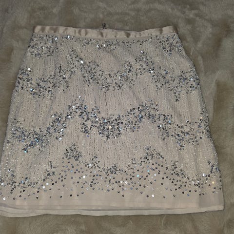 H&M skjørt for dame i størrelse M. Skjørtet er beige og laget i polyester. Det har kort lengde og er dekorert med paljetter og perledetaljer foran og bak. Glidelås i ryggen for lukking. Passer til bruk ved anledninger der man ønsker et pyntet uttrykk.