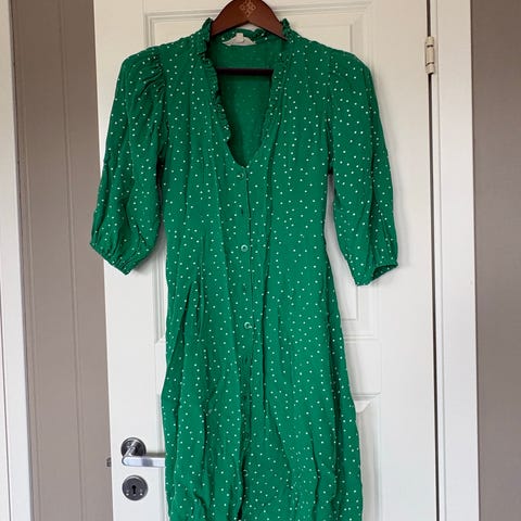 MISSMAYA hverdagskjole i størrelse XS. Kjolen er grønn og laget i polyester. Modellen har korte puffede ermer, rund hals med knappelukking foran og rynkedetaljer i midjen som gir lett innsvinget fasong. Skjørtet har flere sømmer med lett volangpreg. Stoffet har et ton-i-ton blomsterpreget mønster. Passer som hverdagskjole eller til enkle anledninger. Brukt en gang, nypris 1899 kr