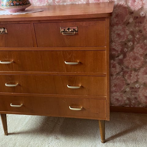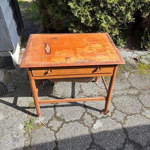 Selger et sjarmerende retro syskrin i tre med praktiske uttrekkbare rom. Perfekt til oppbevaring av syutstyr, hobbyting eller som dekorativ detalj i hjemmet.