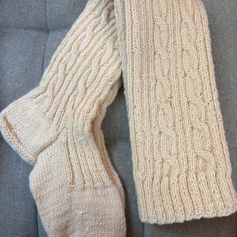 Strømper til herrebunadene. Denne strømpen handstrikka med havskum og flettemønster laga i Sisu-garn frå Sandnes Garn.