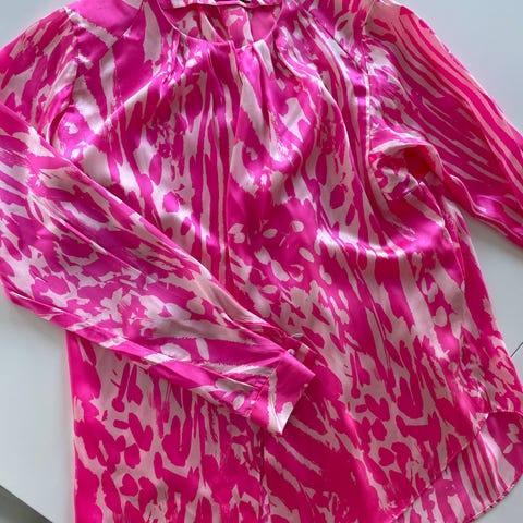 Nydelig silkebluse fra By Malene Birger i størrelse 36. Blusen er laget i silke og har en lys rosa farge. Modellen har lange ermer, mansjetter, med knapper og en løs passform. Detalj ved halsen med knytebånd/skjerf gir mulighet for ulike stylinger. Passer til både bukser og skjørt i hverdags- og kontorantrekk.