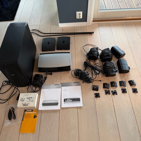 Det følger med alt av kabler, inkludert trådløse bakhøyttalere og stativer.