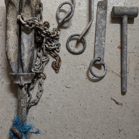 Båtutstyr bestående av flere typer ankre med kjetting samt diverse tauverk i ulike lengder og tykkelser. Bildene viser blant annet foldeanker og andre metallankre, samt kjetting til fortøyning eller ankring. I tillegg følger det med flere typer tau og liner i forskjellige farger og dimensjoner, egnet til bruk om bord i båt, fortøyning eller annet maritimt bruk. Selges samla eller hver for seg, gi bud , kom og se