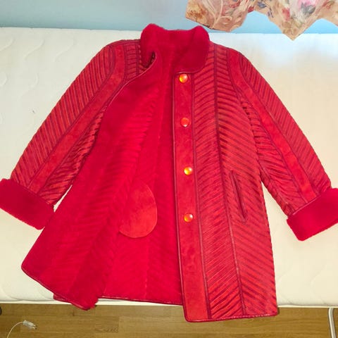 Vintage dyp rød kåpe selges billig. Mener den er i str ca 38/40, står ingen str inni. Kåpa har vært « hengt bort» i årevis og nå tømmes loftet!. Mener det er i ullstoff og er norsk produsert. Selges billig jeg 100 Kannsende