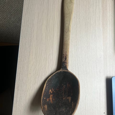 Antikk tresleiv med krok i enden. Spaden er laget i tre med utskåret skaft og krok nederst for oppheng. Passer som bruksgjenstand eller dekorativ gjenstand i interiør med landlig eller tradisjonelt preg.
