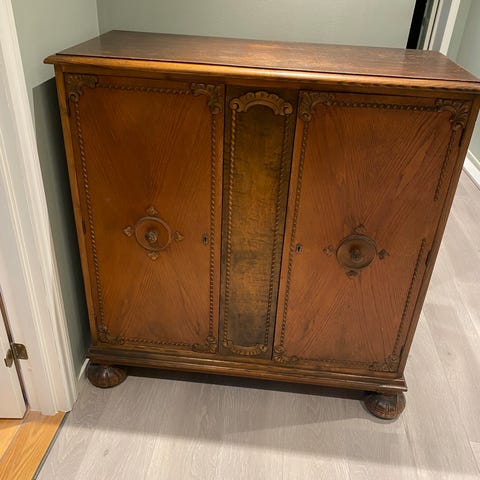 Skjenk / skap fra rundt 1950 tallet dekorer med utskjæringer, på dører og bunnlist .