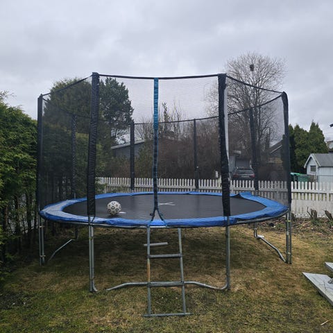 Trofast trampoline gjennom mange år. Godt brukt men mange år igjen. Ny kantbeskyttelse i 2021 og nytt sikkerhetsnett i 2022. Oval, ca 3x4m