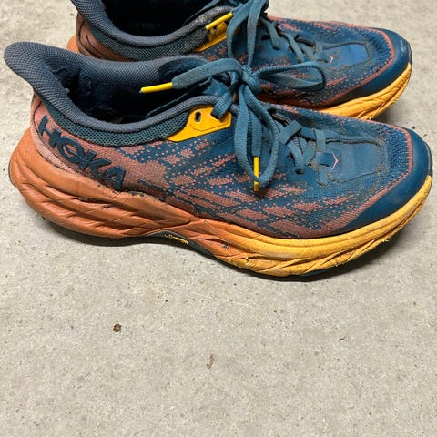 Hoka speedgoat 5. brukt på noen få turer i terrenget. Ca 40km. Egner seg til løping og trening utendørs. Øvre del er i pustende materiale med forsterkninger rundt tå og hæl for bedre stabilitet.