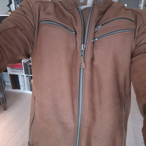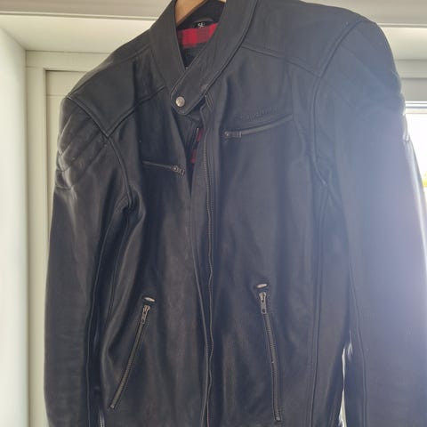 Arlen Ness MC-jakke i skinn i svart farge med hvite striper. Jakken er i størrelse 54. Den har glidelås i front, flere ytterlommer og polstrede partier på skuldre og albuer. Innsiden har et vattert fór med Arlen Ness-logo. Egner seg som kjørejakke til motorsykkel med fokus på beskyttelse og komfort.