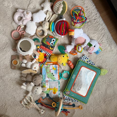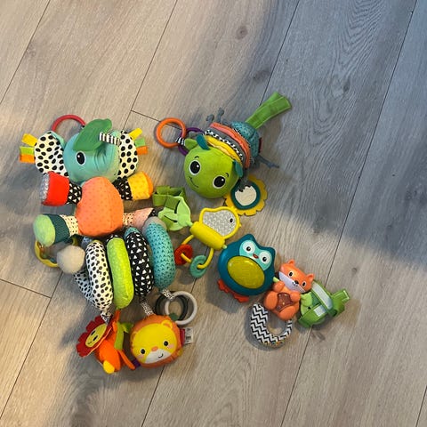 Babyleker fra bla. Liewood (silikon-bitering), Skip-Hop og Infantino. Det hjulet og biteringen er bare noen mnd gamle. Ormen er av treverk.