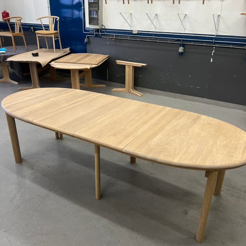 Ovalt heltre bord i bøk med shakerben. 2 ileggsplater.