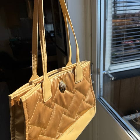 Fantastisk fin Kurt Geiger håndveske i flerfarget, metallisk lær. Ekte skinn. Glitrende logo. Ikke brukt, plasten på håndtaket er fortsatt på. Selges pga opprydding i altfor mange vesker.