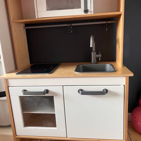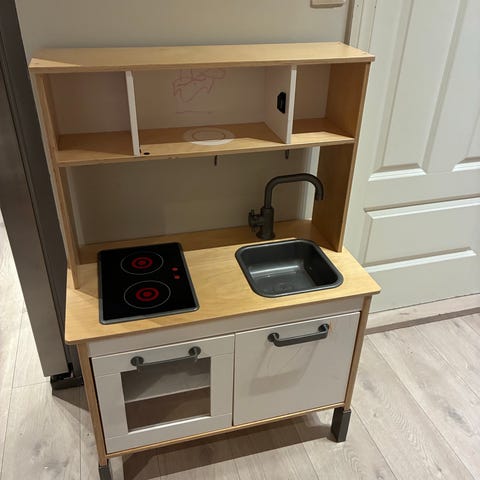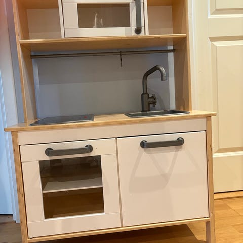 IKEA leke-kjøkken i tre og hvit utførelse. Kjøkkenet har platetopp med to kokeplater, vask med kran og mikrobokslignende overskap. Under benkeplaten er det skap og hyller som kan brukes til oppbevaring av lekemat og kjøkkenutstyr. Egnet som rollelek-kjøkken for barn. Enkel konstruksjon i treverk og plate med plastvask og metallfargede håndtak.