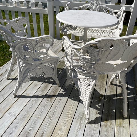 Hagebord og hagestoler i malt metall i fargen lys lilla. Noe rustpreg her og der - se bilder - som er med til å gi det rustikke look. Rundt bord med gjennombrutt rutemønster og dekorative drue- og blomstermotiver i midten og langs kanten. To stoler med tilsvarende rutemønstret sete og dekorative detaljer i ryggen. Både bord og stoler har smijernspreg med buede linjer og utskårne detaljer. Egnet for bruk på terrasse, balkong eller i hage som sittegruppe.