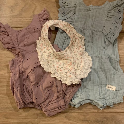 Newbie babyklær i størrelse 62 i rosa toner. Pakken inneholder flere plagg, blant annet bukser, romper og kjole, i myke materialer egnet for baby. Fargene går i lyse og dus rosa- og blomsterprint. Klærne passer til hverdagsbruk og kan kombineres som sett eller brukes hver for seg etter behov.