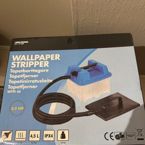 CoTech Wallpaper Stripper tapetfjerner med effekt på 2000 W. Enheten bruker damp for å fjerne tapet uten bruk av kjemikalier. Leveres med damptank og tilkoblingsslange samt dampplate for påføring på veggen. Strømtilkobling 230 V / 50 Hz. Kabellengde er 3 meter ifølge emballasjen. Egnet til fjerning av tapet innendørs i bolig eller andre lokaler der tapet skal tas ned før videre overflatebehandling.