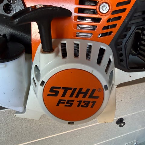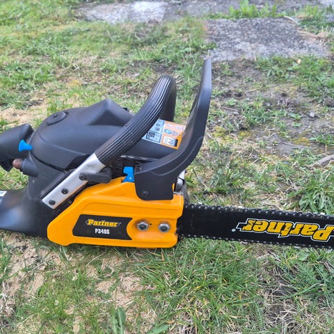 Motorsag med 14" sverd. Medfølgende utstyr inkluderer kjedebeskyttelse, bensinkanne og verktøy for vedlikehold samt ekstra kjede (brukt) og bruksanvisning. Egnet til kapping av ved og annet trevirke.