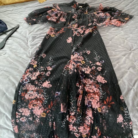byTiMo festkjole for dame i størrelse L. Kjolen er marineblå med blomstermønster, helforet med stoff i viskose. Modellen har lange, vide ermer og rund hals. Stoffet er lett og faller mykt. Passer til bruk ved festlige anledninger og andre situasjoner der man ønsker en kjole med særpreg. løs passform på kjolen. Kjolen er kun prøvd på. Ble feil str. for min del. Kjolen er nydelig!