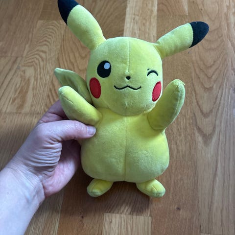 Pokémon Pikachu kosedyr selges. Myk plysjfigur som er skikkelig søt! Et favorittkosedyr for barn som liker Pokémon-universet. Merkelapp med Pokémon-logo er festet på siden av kosedyret.