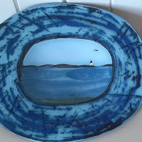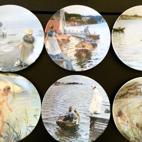 Dekortallerkener, 5 stk. fra Rørstrand. Kunstner Anders Zorn. Veggtallerken i porselen med motiv inspirert av norsk sommer- og sjøliv. Tallerkenen er rund og dekorert med detaljrike motiver av mennesker ved vannet, robåter og bryggemiljø. Baksiden har påskrift med tittel, informasjon om motivet og produsentstempel. Tallerkenen er utstyrt med opphengsanordning og er egnet som veggdekor. Passer i interiør der man ønsker klassiske, maritime og naturinspirerte motiver på veggen.