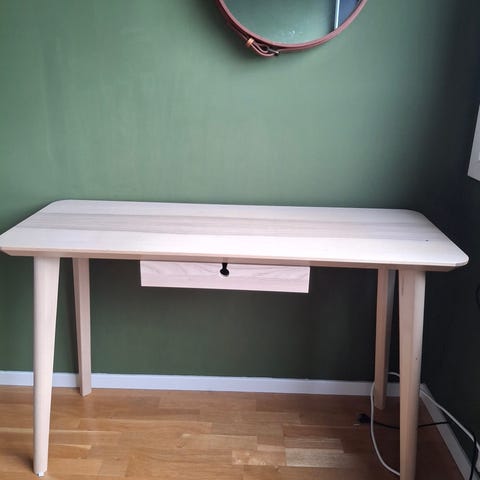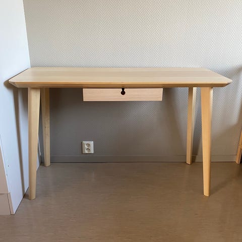 Skrivebord i eik med skuffer med skinnhempe for å åpne. Hjørnebeskytterne for å unngå at småtroll skader seg, kan følge med😊