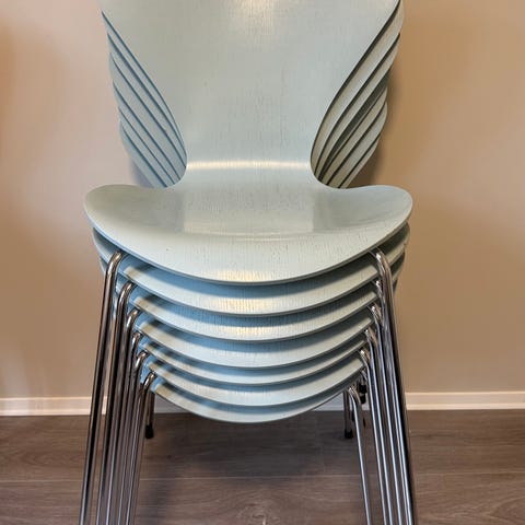 Fritz Hansen Serie 7 stol designet av Arne Jacobsen. Klassisk skallstol med formpresset sete og rygg i trefinér/laminat og understell i metall. Stolen er stablebar og egner seg til bruk ved spisebord, på kjøkken, kontor eller møteområde. Finnes i flere farger og med ulike understellsløsninger avhengig av variant.