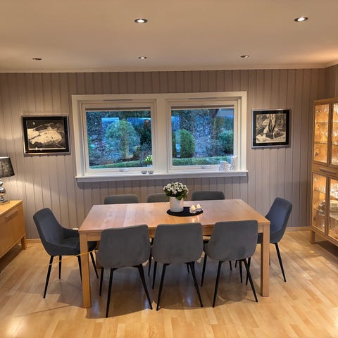 Settet er egnet som spisegruppe i kjøkken eller spisestue, og gir plass til flere sitteplasser rundt bordet.