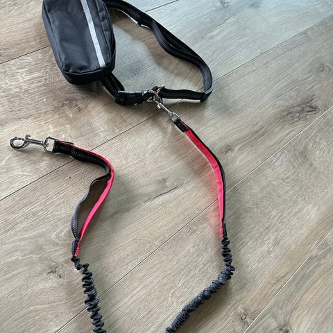 Hundebånd med magebelte og liten oppbevaringslomme. Båndet har elastisk parti som gir demping ved rykk, samt karabinkrok for feste til halsbånd eller sele. Magebeltet er justerbart og har klipslukking. Lommen er i svart tekstil med refleksstripe og kan brukes til småting som nøkler eller godbiter. Egnet til tur og jogging med hund.