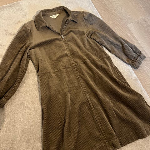 b.young hverdagskjole i brun cordfløyel i størrelse 42 for dame. Kjolen har lange ermer og knepping foran. Skjørtedelen er lett rynket for ekstra vidde. Materialet er cordfløyel med tydelig struktur. Passer som hverdagskjole i en avslappet stil.