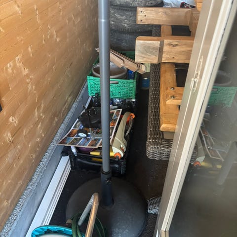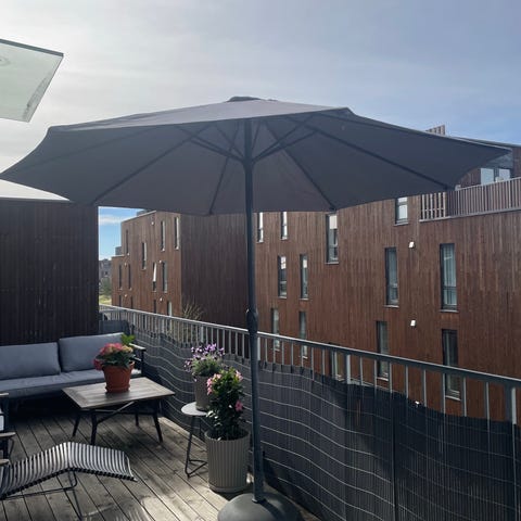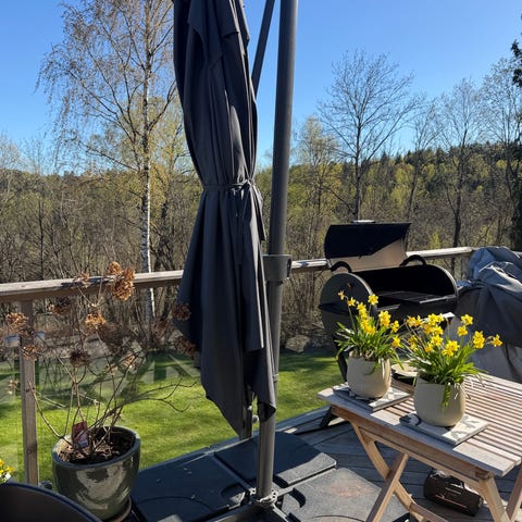 Parasoll sort, 3 mtr i dia., med rund betongfot 40 kg i grå utførelse. Parasollen har sort duk og metallstang, og leveres med trekk/overtrekk for beskyttelse når den ikke er i bruk. Egnet for bruk på terrasse eller i hage som solskjerming over sittegruppe eller spiseplass utendørs.