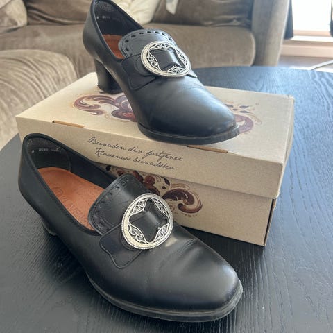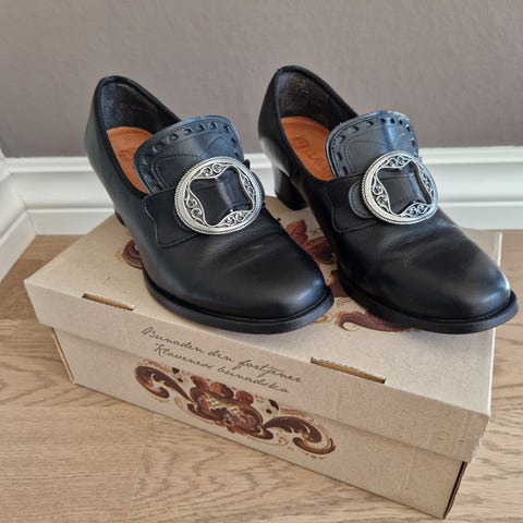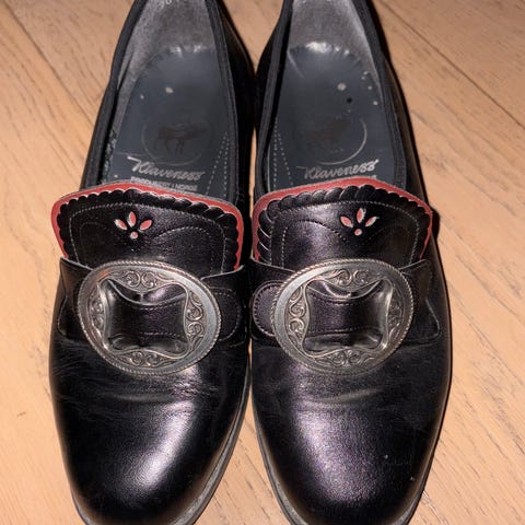 Klaveness Dame bunadssko med hæl på 4,5cm. Pent brukt og i god stand. 2,5 størrelse, som tilsvarer 35. Skoeske følger med.