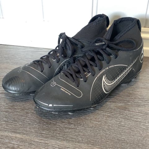 Nike fotballsko i grå farge med svart såle og knotter. Skoene har snøring foran og middels høy ankelsokkkonstruksjon for tettere passform rundt ankelen. Overdelen er i syntetisk materiale med stor Nike-logo på sidene. Knottemønsteret på yttersålen er tilpasset bruk på kunstgress eller hardere underlag. Passer som trenings- eller kampsko til fotball. Kun brukt to ganger da de var for små.