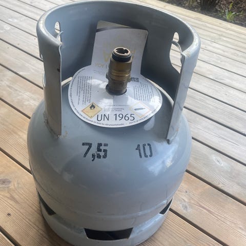 Gassflaske i grå farge. Egner seg til bruk med gassgrill, kokeapparater eller annet utstyr tilpasset denne typen gassbeholder. Nøyaktig volum og tilkoblingstype er ikke oppgitt og bør kontrolleres før bruk.