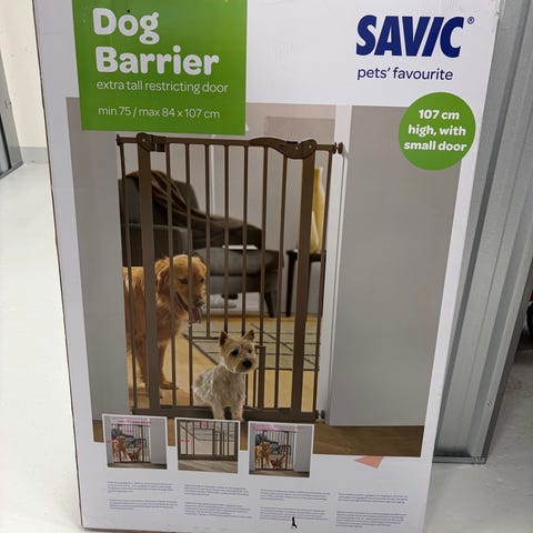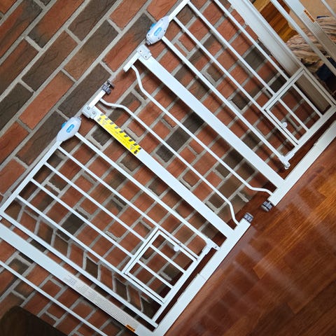 Praktisk grind som passer perfekt i døråpninger eller mellom rom. Den har en egen liten luke slik at mindre dyr kan gå gjennom, mens større dyr holdes ute.
