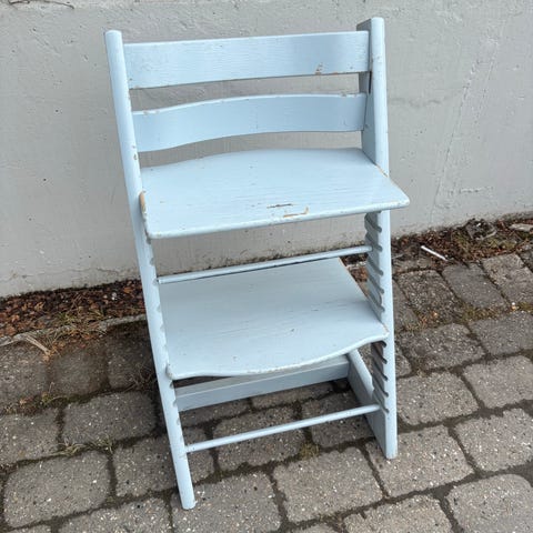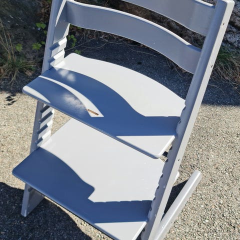 Stokke Tripp Trapp høy barnestol i grå farge. Klassisk trappeformet stol med justerbar sitteplate og fotbrett som kan tilpasses barnets høyde. Stolen er laget i tre med metallstenger under setet og fotbrettet for stabilitet. Egnet som spise- og sitteplass ved bord for barn, og kan justeres etter hvert som barnet vokser.