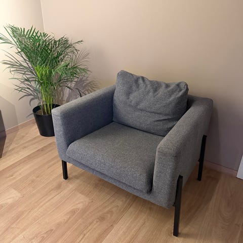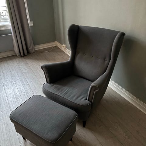 Flott lenestol i klassisk design selges. Stolen har høy rygg og gode armlener med svært god sittekomfort. Ørelappstolen er en Nordvalla mørk grå fra IKEA. Ny pris kr. 2995. Noen bruksmerker.