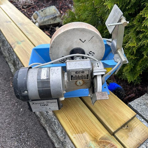 A.O.K. 10" Wet Stone Grinder slipemaskin med våtslipeskive på ca. 10" (250 mm). Maskinen har elektrisk motor og er beregnet for våtsliping av kniver, verktøy og andre stålredskaper. Slipemaskinen har vannkar under steinen for kjøling under sliping. Egnet for verksted, hobbybruk og annet arbeid der det er behov for kontrollert og jevn sliping av eggverktøy.