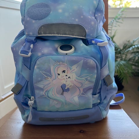 Skolesekk. Brukt av et barn i 1-2 klasse. Følger med regntrekk. Det er et par små hull i trekket, se bilde.