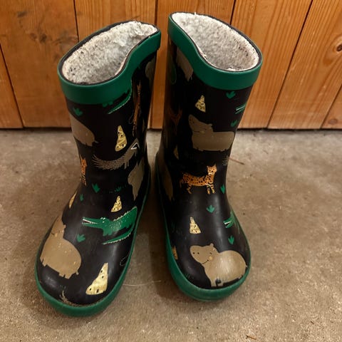 Vannmelonstøvler str.24. Brukt av ett barn. Mye plasking i søledammer igjen i disse.