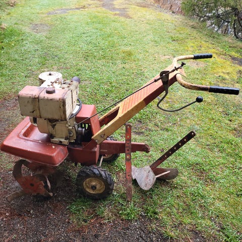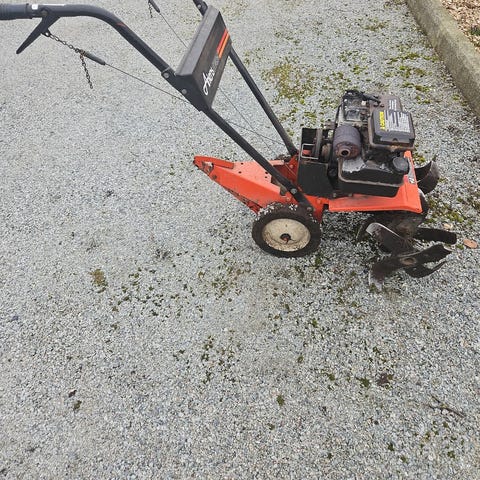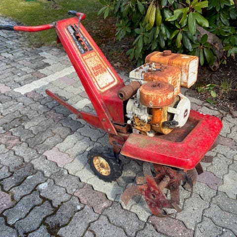 Gilson Compact Tiller jordfreser med bensinmotor. Maskinen har stående motor montert foran og fresestjerner bak. Håndtak og ramme er i stål, lakkert i rødt, med betjeningshendler på styret. Egnet til jordbearbeiding i hage og mindre åkerfelt, for eksempel til klargjøring av bed og grønnsakshage. Maskinen er konstruert for å løsne og vende jord, samt blande inn kompost eller gjødsel før planting. Nylig skiftet treningssystem. Går jevnt og godt. Se: Youtube. https://youtube.com/shorts/1iFSydeVjr4