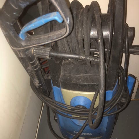 Høytrykkspyleren kan brukes til rengjøring av uteområder, kjøretøy, fasader og annet utstyr som tåler høytrykksspyling. Det følger med strømkabel og slange, samt håndtak og festepunkter for tilbehør slik det vises på bildene. Eventuelle skader eller slitasje på deler fremgår av bildene og bør vurderes før bruk eller eventuell utskifting av komponenter.