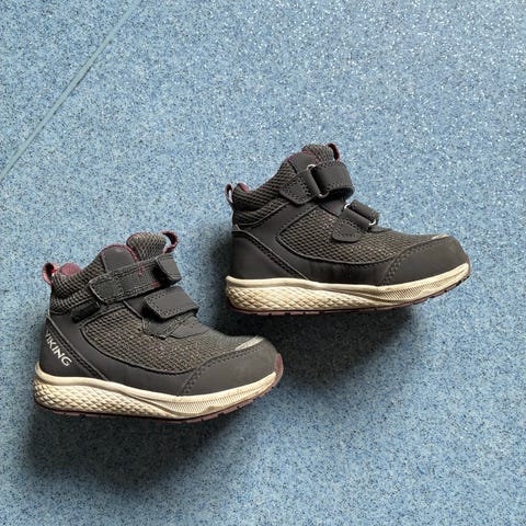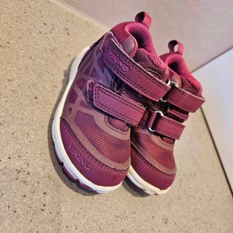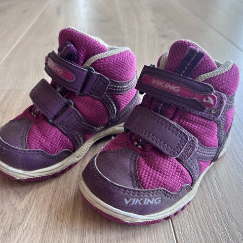 Viking barnesko i størrelse 22 for jente. Skoene er i en lilla fargetone med to borrelåsstropper som gjør dem enkle å ta av og på. Vanntette.