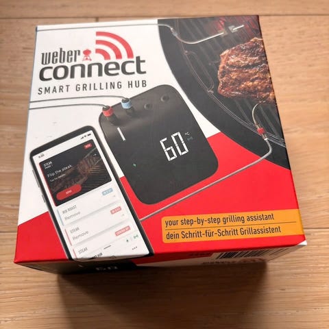 Weber iGrill 3 grilltermometer med Bluetooth-tilkobling. Enheten monteres på grillen og kobles trådløst til kompatibel smarttelefon eller nettbrett for overvåking av temperatur. Produktet er designet for bruk sammen med Weber gassgriller i seriene Genesis II, Genesis II LX og Spirit II. Leveres i original eske med illustrasjoner og bruksinformasjon på emballasjen.