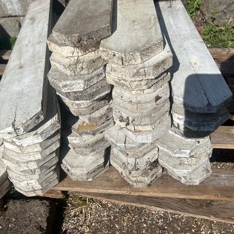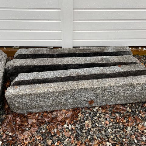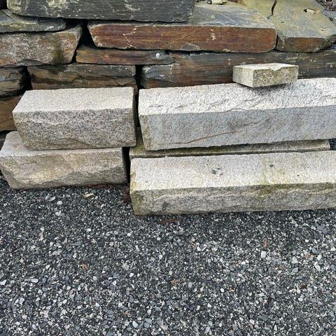Naturstein kantstein i grå stein. Rektangulære blokker stablet på pall, egnet til bruk som kantstein langs innkjørsler, gangveier, bed eller andre uteområder. Steinen har grov, ubehandlet overflate og varierende kanter som gir et robust uttrykk. Leveres som flere like store steinblokker på én pall.