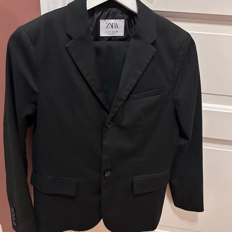 Zara dressjakke for gutt i størrelse 134. Jakken er svart og laget i ekstra fin ull med innsvinget, skreddersydd passform (tailored fit). Modellen har klassisk snitt med jakkeslag, knappelukking foran og lommer. Egnet som penjakke til for eksempel selskap, konfirmasjon eller andre anledninger der det trengs mer formelt tøy.